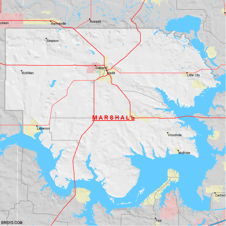 The estimated population of Marshall County is 16,212 with 6,490 households. These households are spread across 8 unique municipalties (not all shown).