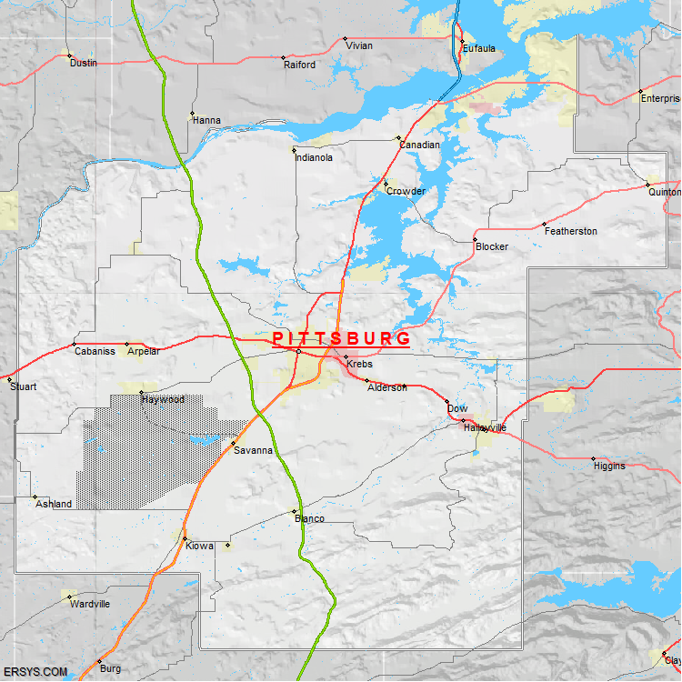 The estimated population of Pittsburg County is 43,789 with 17,362 households. These households are spread across 23 unique municipalties (not all shown).