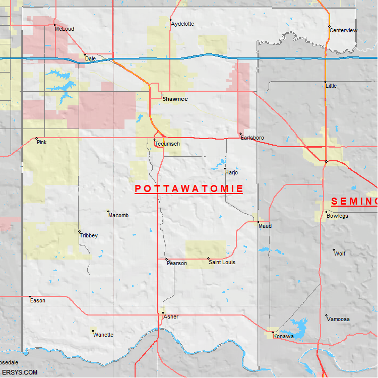 Pottawatomie County, OK (shown in white) has 787.79 mi² of land area and 5.73 mi² of water resources. The county is bordered by: