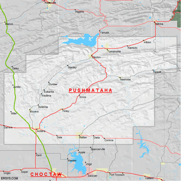 Pushmataha County, OK (shown in white) has 1,395.54 mi² of land area and 27.02 mi² of water resources. The county is bordered by: