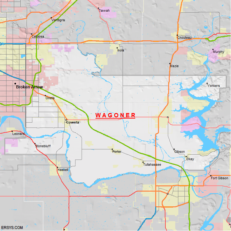 The estimated population of Wagoner County is 90,409 with 33,393 households. These households are spread across 13 unique municipalties (not all shown).