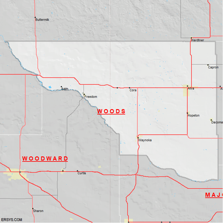 Woods County, OK (shown in white) has 1,286.48 mi² of land area and 3.51 mi² of water resources. The county is bordered by: