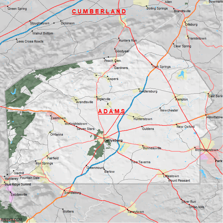 Adams County, PA (shown in white) has 518.69 mi² of land area and 3 mi² of water resources. The county is bordered by: