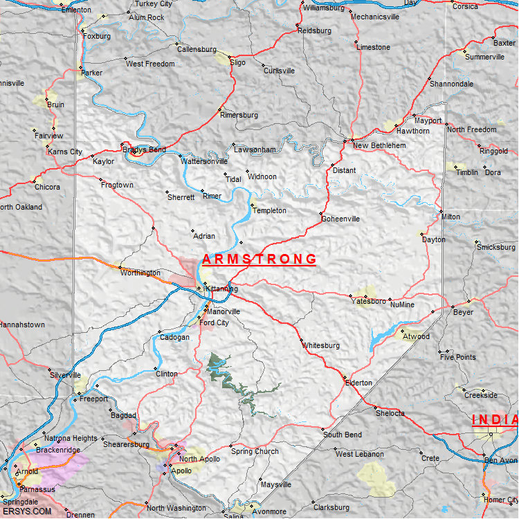 Armstrong County, PA (shown in white) has 653.32 mi² of land area and 10.65 mi² of water resources. The county is bordered by: