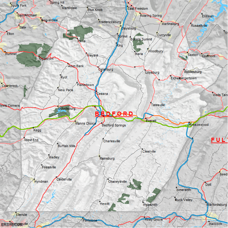 Bedford County, PA (shown in white) has 1,012.24 mi² of land area and 4.63 mi² of water resources. The county is bordered by: