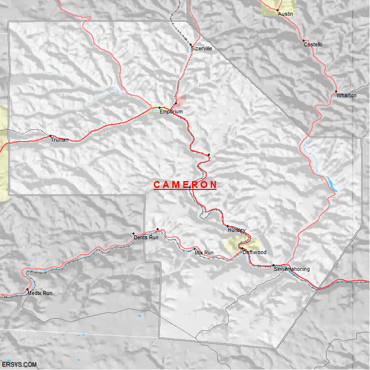 Cameron County, PA (shown in white) has 396.23 mi² of land area and 2.18 mi² of water resources. The county is bordered by: