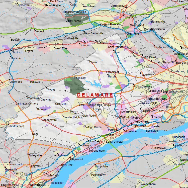Delaware County, PA (shown in white) has 183.81 mi² of land area and 6.79 mi² of water resources. The county is bordered by: