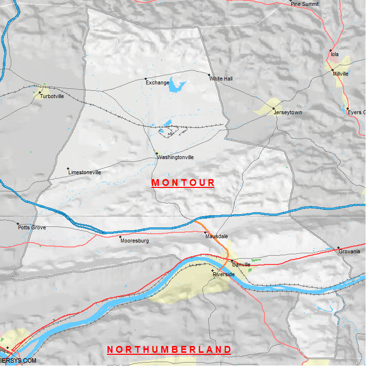 Montour County, PA (shown in white) has 130.33 mi² of land area and 2 mi² of water resources. The county is bordered by:
