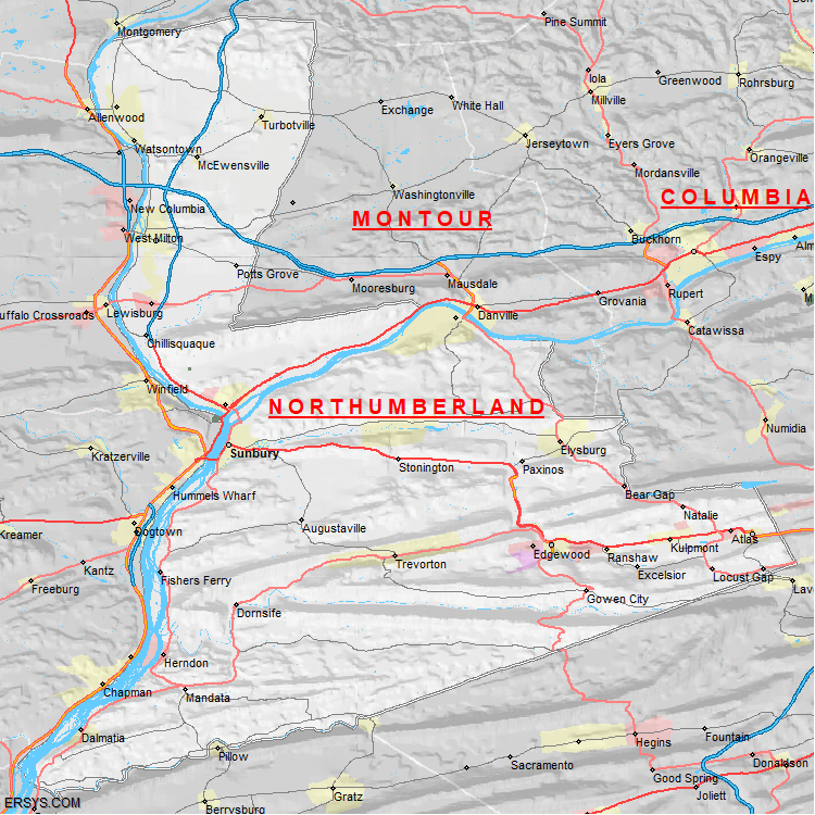 Northumberland County, PA (shown in white) has 457.68 mi² of land area and 19.55 mi² of water resources. The county is bordered by:
