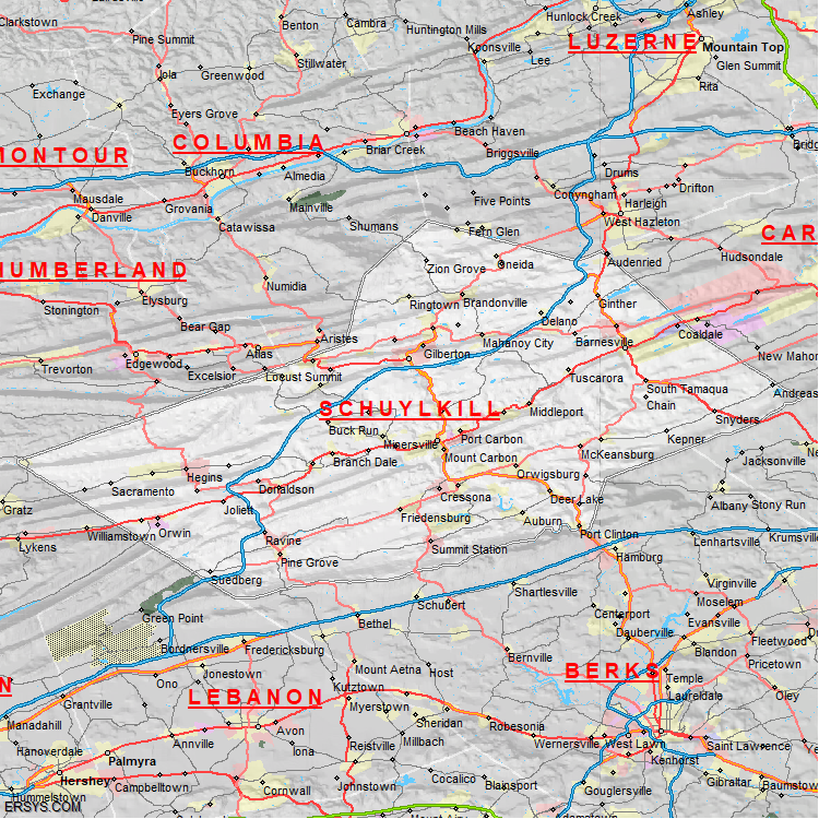 Schuylkill County, PA (shown in white) has 778.58 mi² of land area and 4.18 mi² of water resources. The county is bordered by: