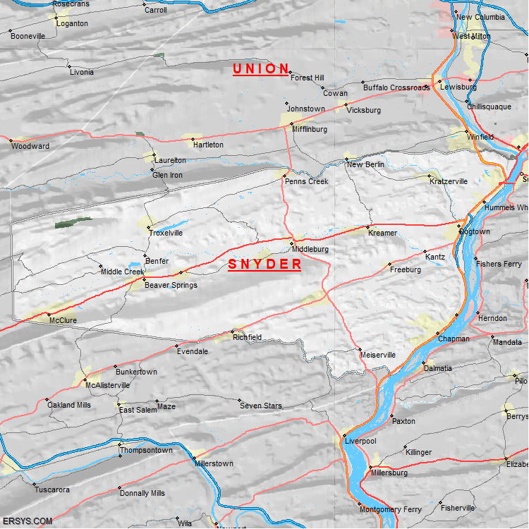 Snyder County, PA (shown in white) has 328.78 mi² of land area and 2.76 mi² of water resources. The county is bordered by: