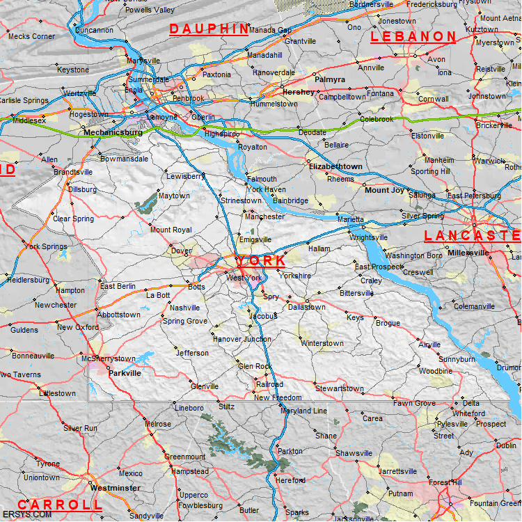 York County, PA (shown in white) has 904.37 mi² of land area and 6.37 mi² of water resources. The county is bordered by: