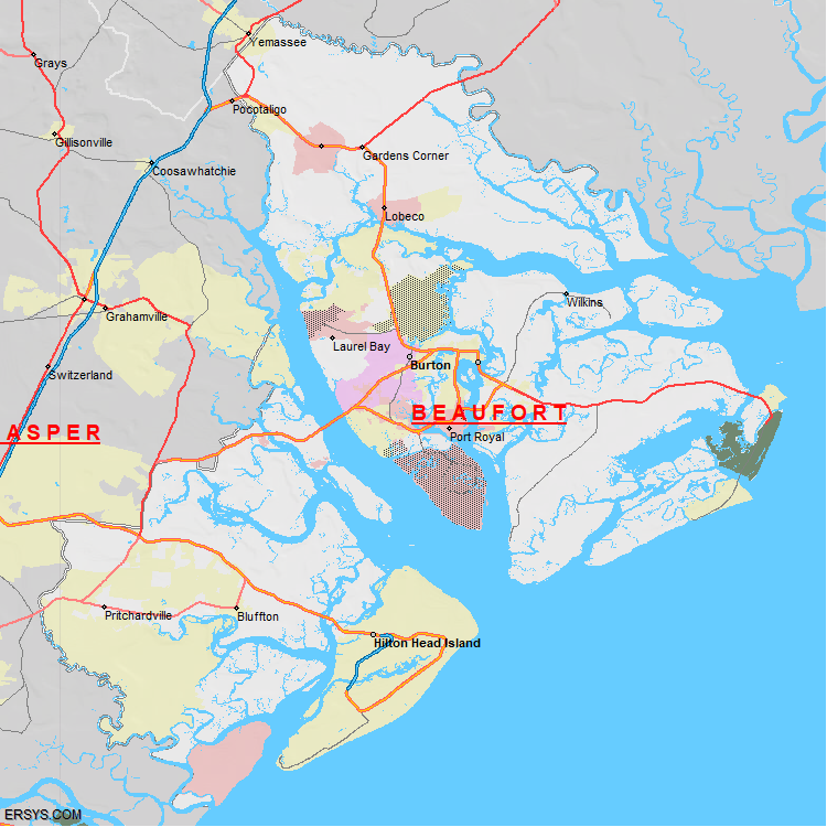 Beaufort County, SC (shown in white) has 576.04 mi² of land area and 347.44 mi² of water resources. The county is bordered by: