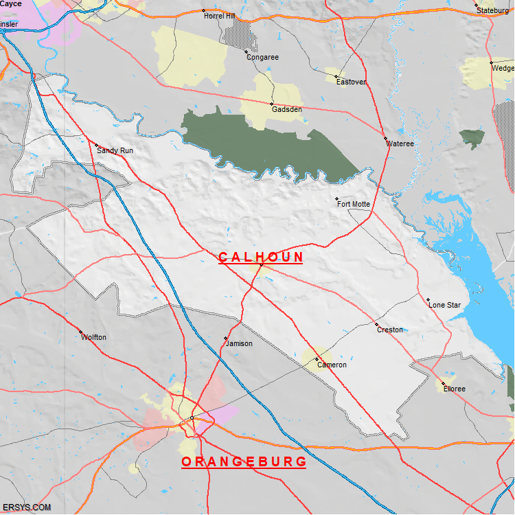 Calhoun County, SC (shown in white) has 381.15 mi² of land area and 11.33 mi² of water resources. The county is bordered by: