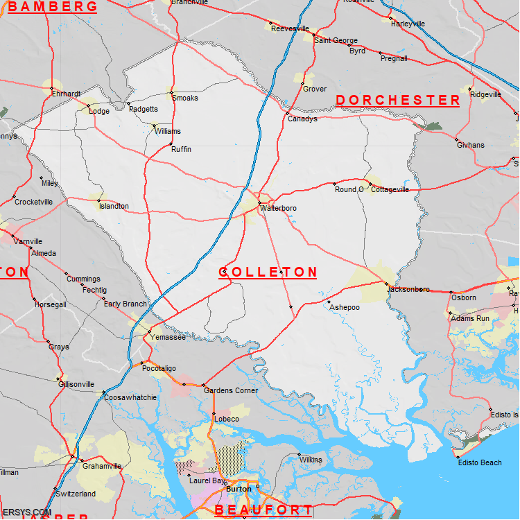 The estimated population of Colleton County is 39,885 with 16,368 households. These households are spread across 8 unique municipalties (not all shown).