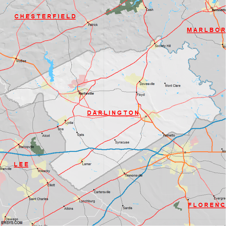 The estimated population of Darlington County is 63,716 with 25,985 households. These households are spread across 8 unique municipalties (not all shown).