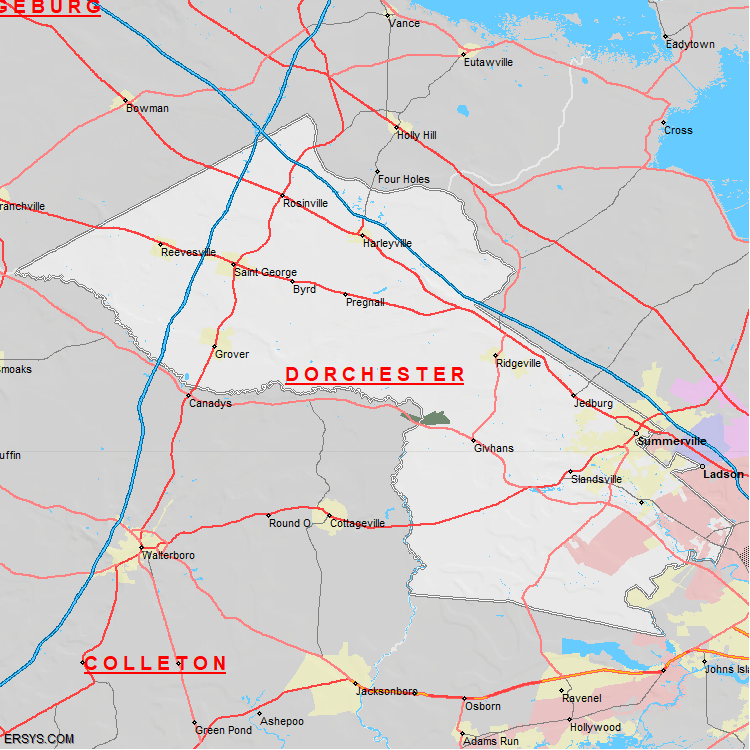 Dorchester County, SC (shown in white) has 568.48 mi² of land area and 2.62 mi² of water resources. The county is bordered by: