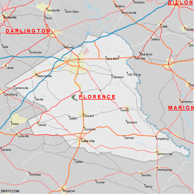 Florence County, SC (shown in white) has 800.51 mi² of land area and 3.77 mi² of water resources. The county is bordered by: