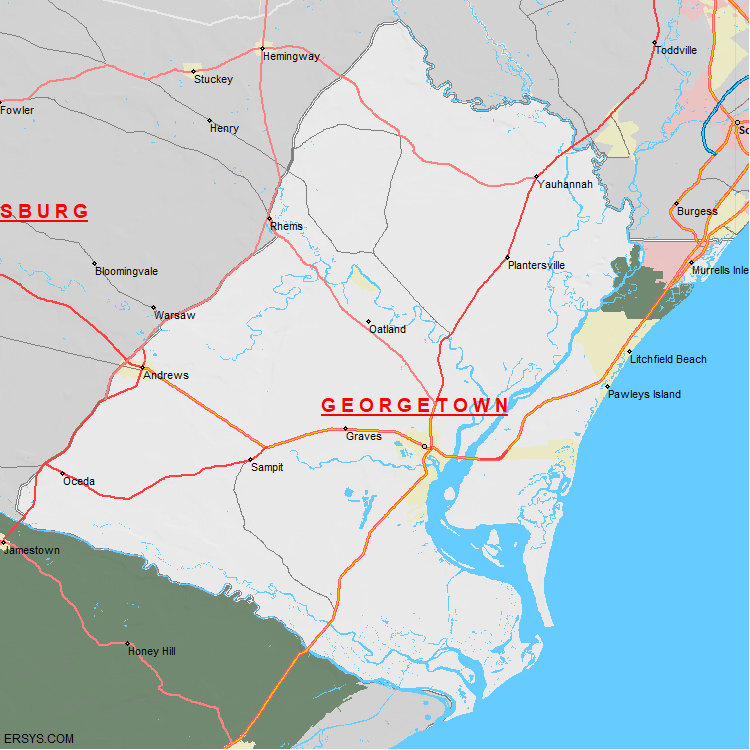 The estimated population of Georgetown County is 67,150 with 28,939 households. These households are spread across 7 unique municipalties (not all shown).