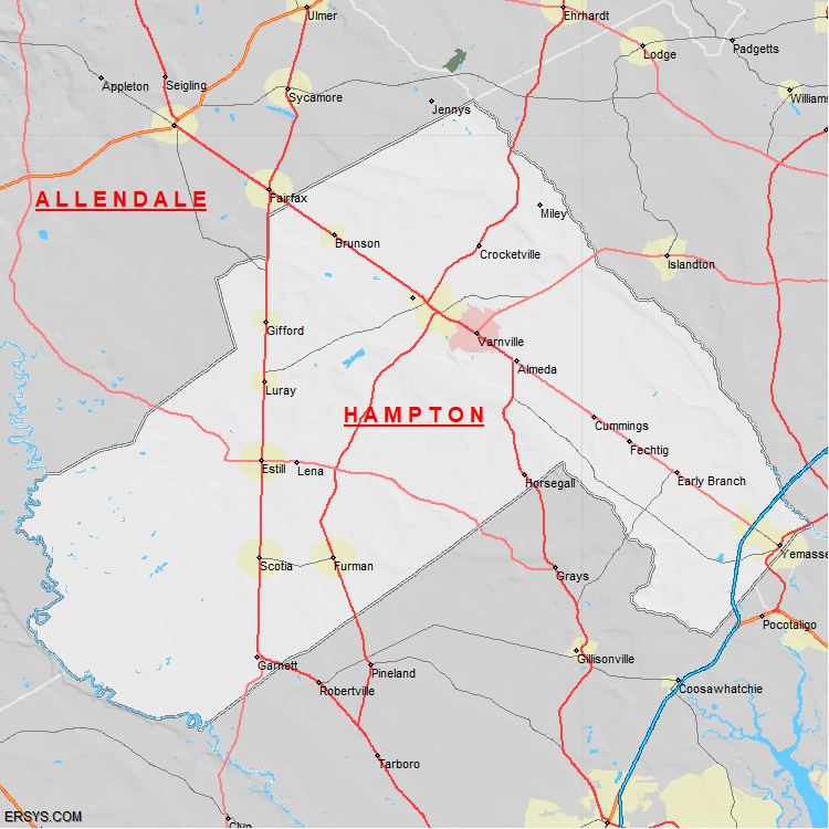 The estimated population of Hampton County is 19,010 with 7,369 households. These households are spread across 9 unique municipalties (not all shown).