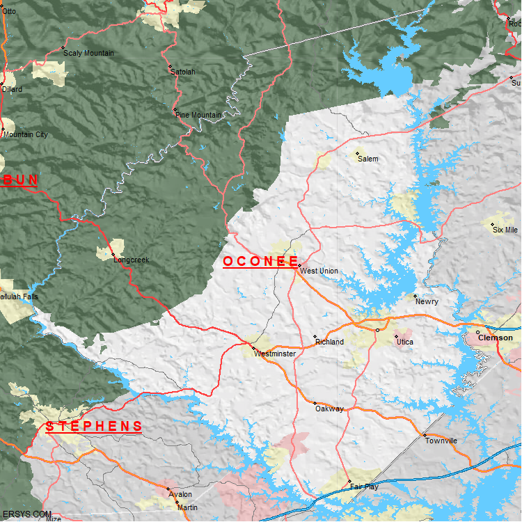 Oconee County, SC (shown in white) has 626.57 mi² of land area and 46.99 mi² of water resources. The county is bordered by: