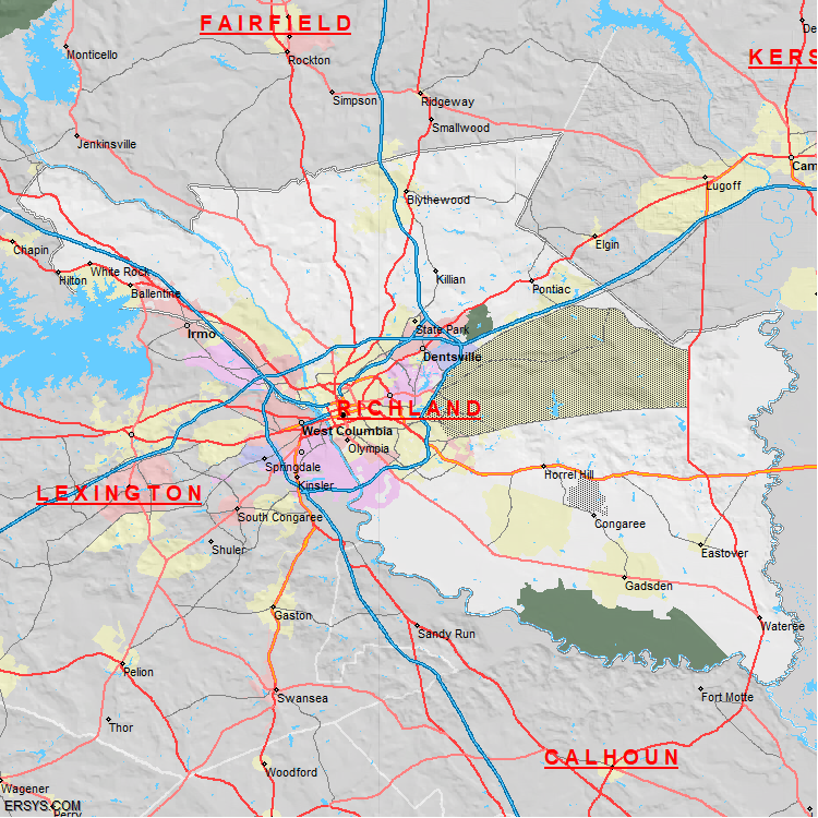 Richland County, SC (shown in white) has 757.31 mi² of land area and 14.65 mi² of water resources. The county is bordered by: