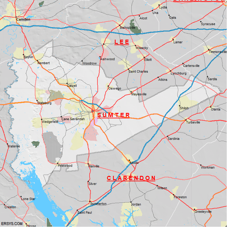 Sumter County, SC (shown in white) has 665.08 mi² of land area and 17.01 mi² of water resources. The county is bordered by: