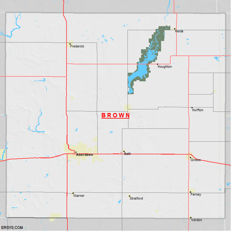 Brown County, SD (shown in white) has 1,713.03 mi² of land area and 17.92 mi² of water resources. The county is bordered by: