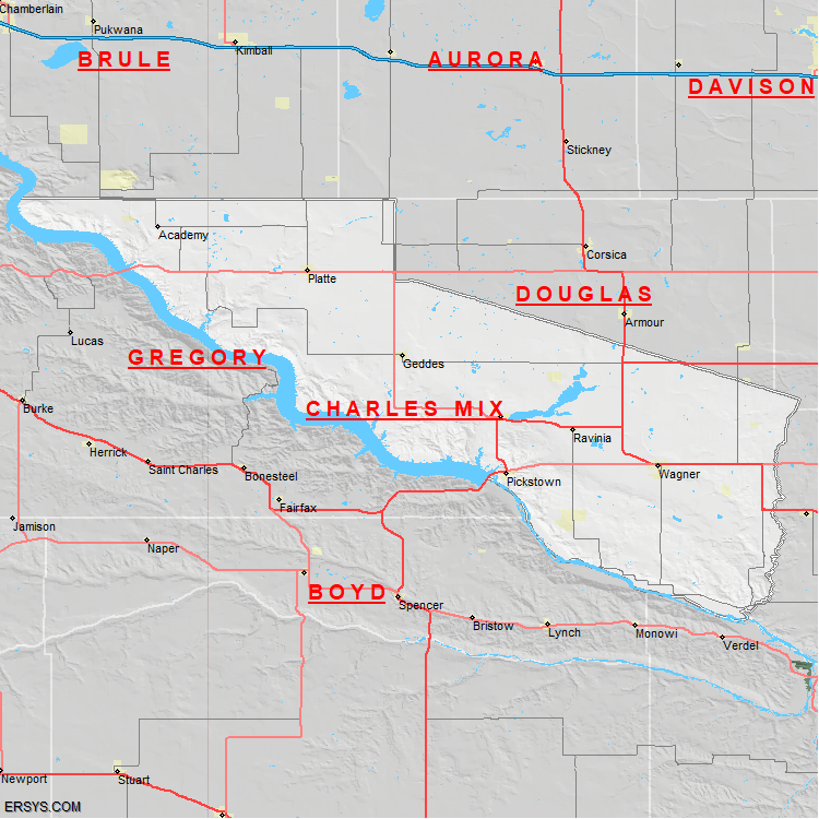 The estimated population of Charles Mix County is 9,313 with 3,028 households. These households are spread across 11 unique municipalties (not all shown).