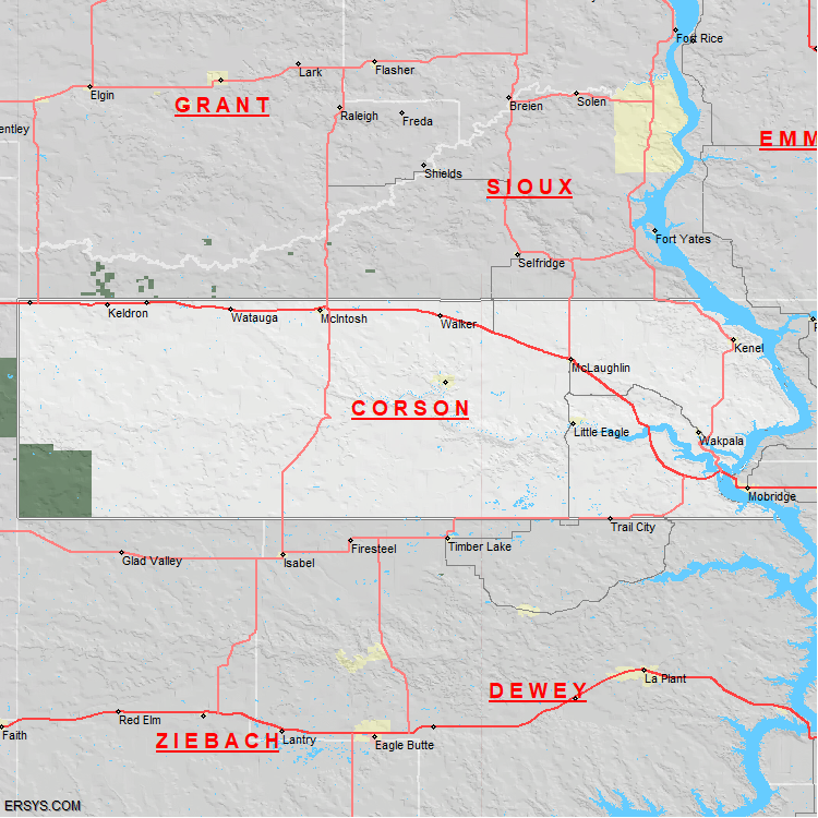 The estimated population of Corson County is 3,846 with 1,180 households. These households are spread across 7 unique municipalties (not all shown).
