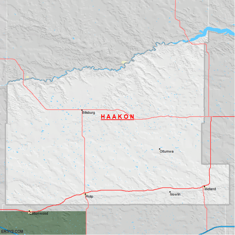 Haakon County, SD (shown in white) has 1,810.54 mi² of land area and 16.39 mi² of water resources. The county is bordered by: