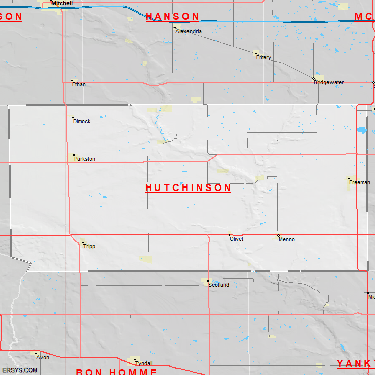 The estimated population of Hutchinson County is 7,472 with 2,819 households. These households are spread across 13 unique municipalties (not all shown).