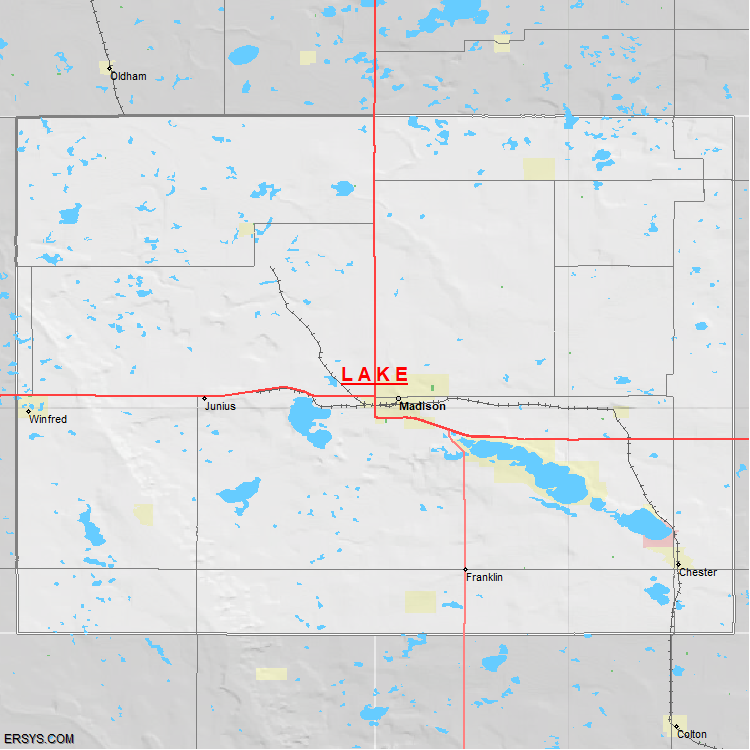 Lake County, SD (shown in white) has 562.89 mi² of land area and 12.27 mi² of water resources. The county is bordered by: