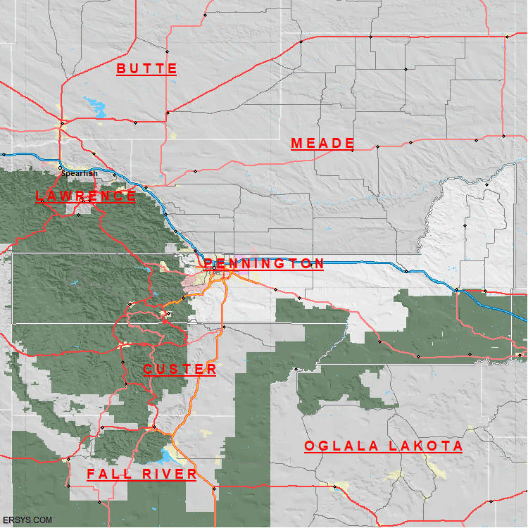 Pennington County, SD (shown in white) has 2,776.77 mi² of land area and 7.69 mi² of water resources. The county is bordered by: