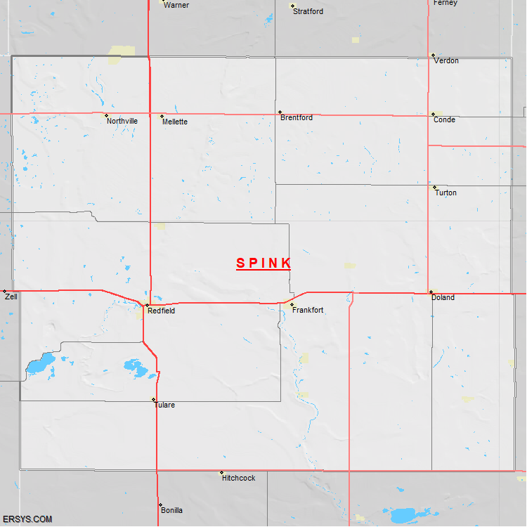 The estimated population of Spink County is 6,318 with 2,506 households. These households are spread across 15 unique municipalties (not all shown).