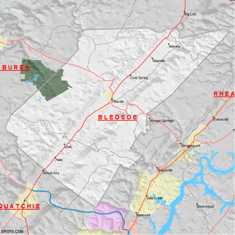 Bledsoe County, TN (shown in white) has 406.56 mi² of land area and 0.33 mi² of water resources. The county is bordered by: