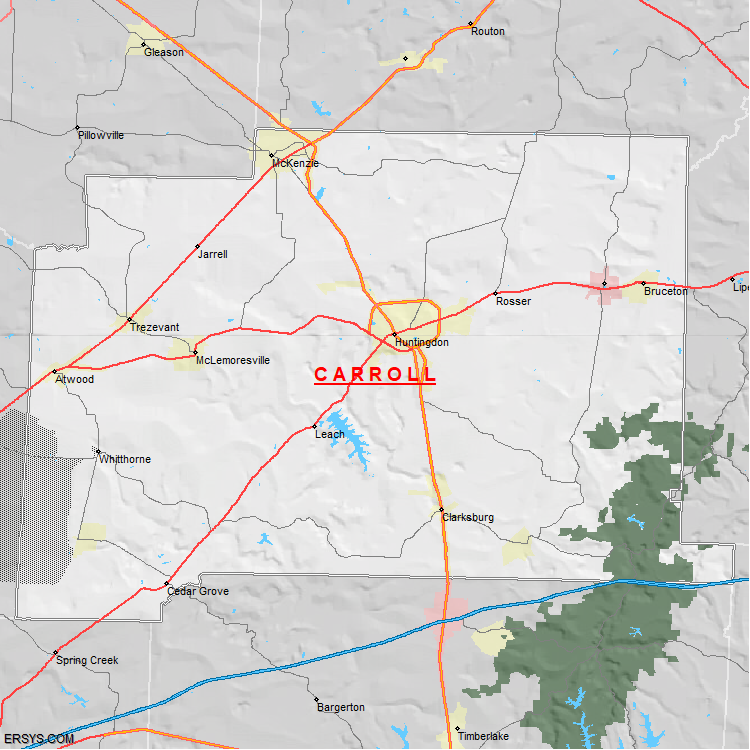 Carroll County, TN (shown in white) has 597.66 mi² of land area and 2.44 mi² of water resources. The county is bordered by: