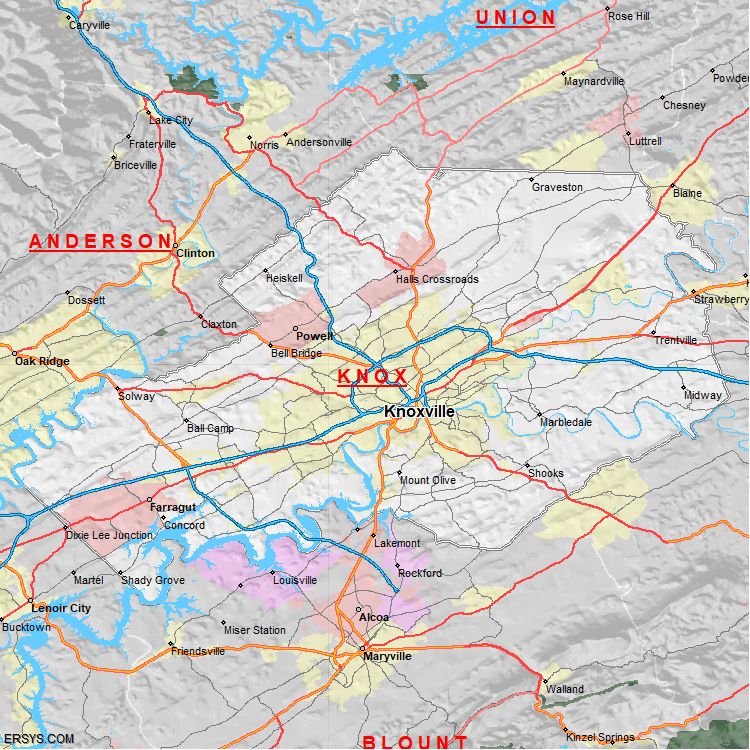 Knox County, TN (shown in white) has 508.34 mi² of land area and 17.58 mi² of water resources. The county is bordered by: