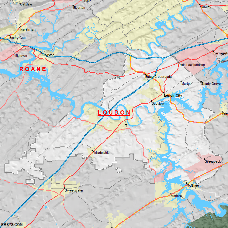 Loudon County, TN (shown in white) has 229.27 mi² of land area and 18.1 mi² of water resources. The county is bordered by: