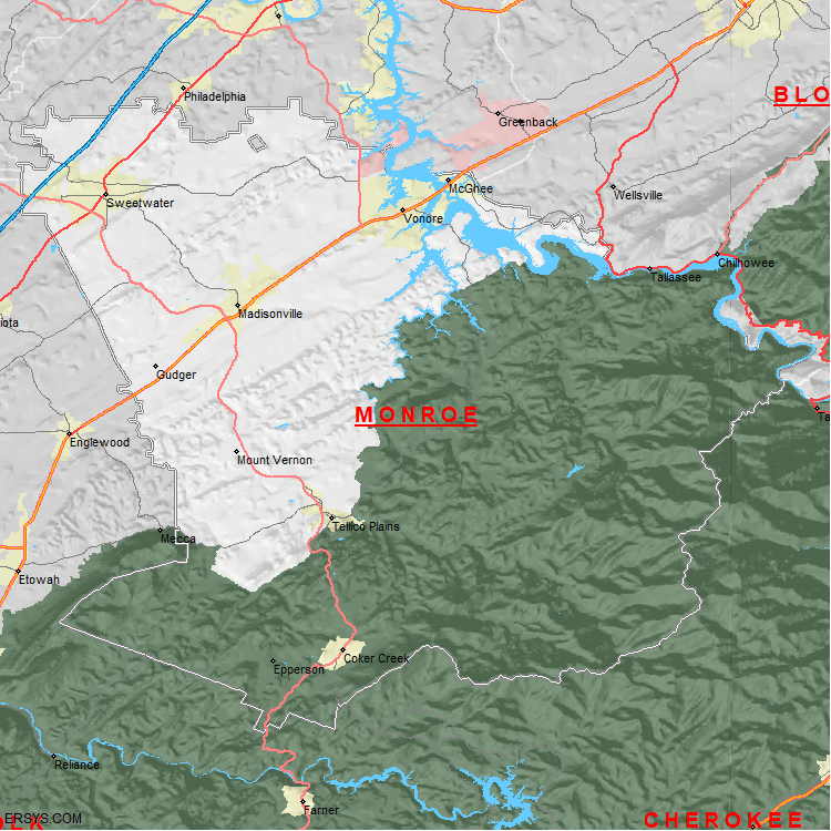 Monroe County, TN (shown in white) has 635.77 mi² of land area and 16.81 mi² of water resources. The county is bordered by: