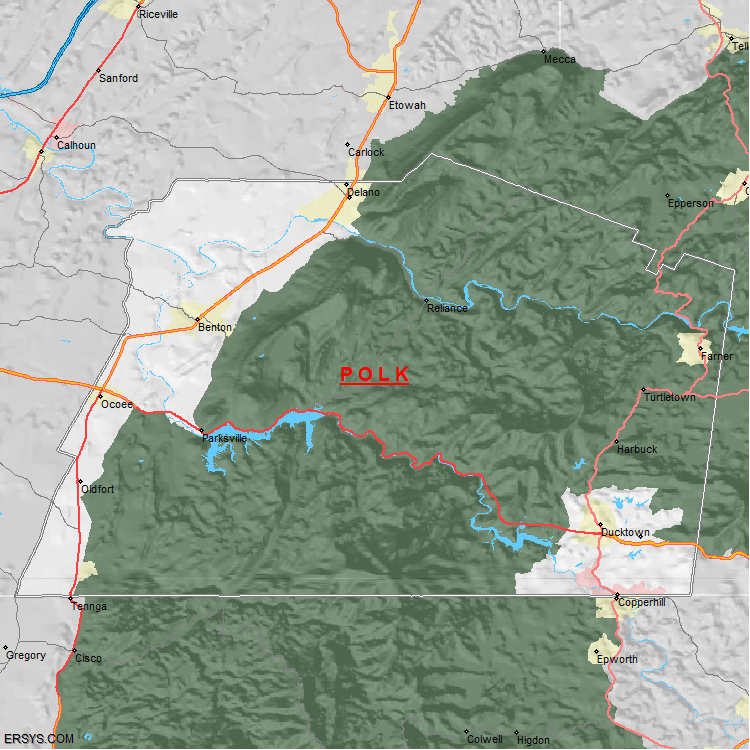 Polk County, TN (shown in white) has 434.61 mi² of land area and 7.69 mi² of water resources. The county is bordered by: