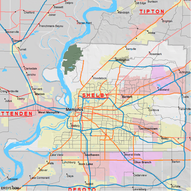 Shelby County, TN (shown in white) has 760.55 mi² of land area and 19.81 mi² of water resources. The county is bordered by: