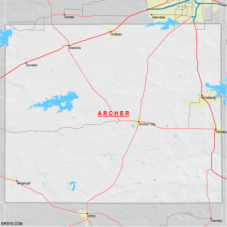 The estimated population of Archer County is 9,081 with 3,600 households. These households are spread across 6 unique municipalties (not all shown).