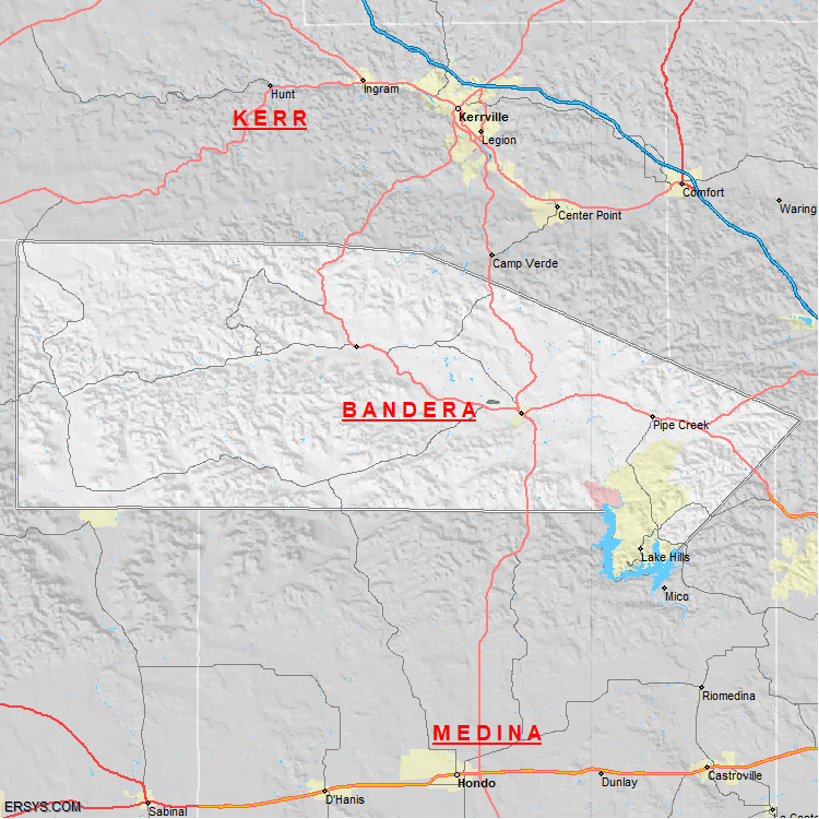 The estimated population of Bandera County is 22,811 with 9,695 households. These households are spread across 3 unique municipalties (not all shown).