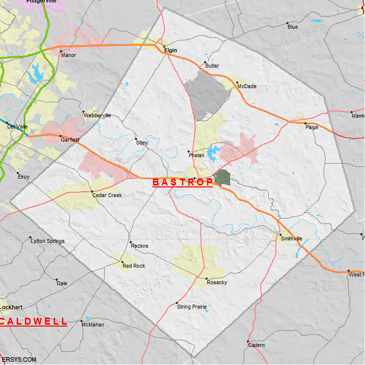The estimated population of Bastrop County is 115,487 with 39,518 households. These households are spread across 11 unique municipalties (not all shown).