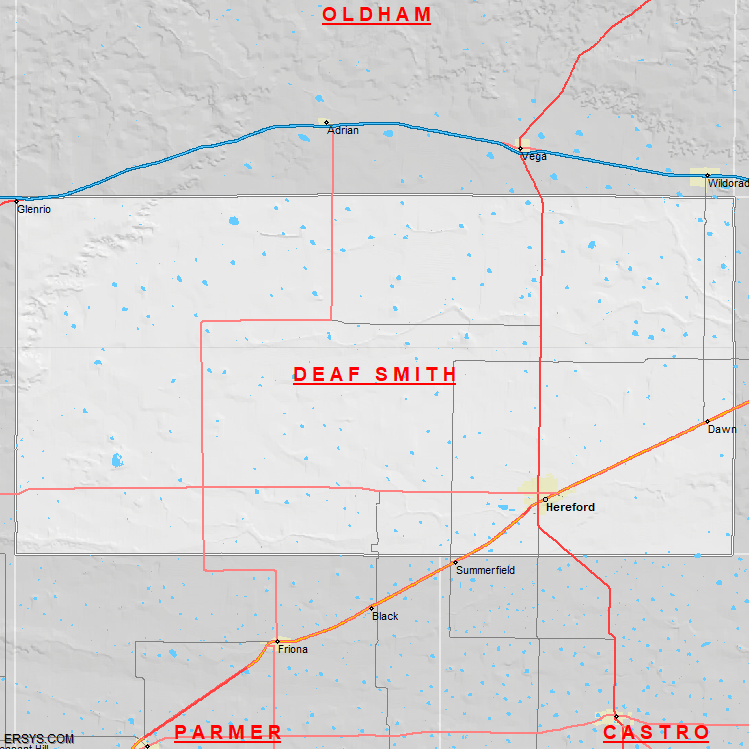Deaf Smith County, TX (shown in white) has 1,496.82 mi² of land area and 1.52 mi² of water resources. The county is bordered by:
