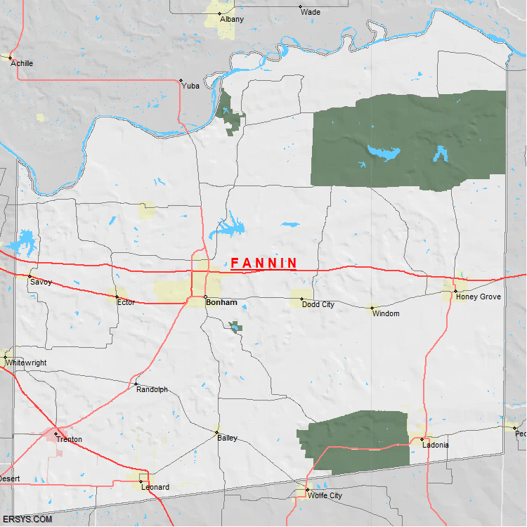 Fannin County, TX (shown in white) has 890.83 mi² of land area and 8.05 mi² of water resources. The county is bordered by: