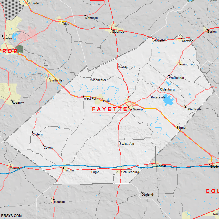 Fayette County, TX (shown in white) has 949.93 mi² of land area and 9.87 mi² of water resources. The county is bordered by: