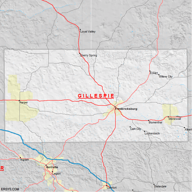 Gillespie County, TX (shown in white) has 1,058.2 mi² of land area and 3.48 mi² of water resources. The county is bordered by: