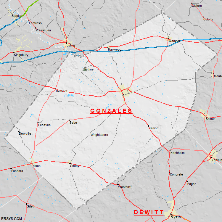 The estimated population of Gonzales County is 20,206 with 7,486 households. These households are spread across 5 unique municipalties (not all shown).
